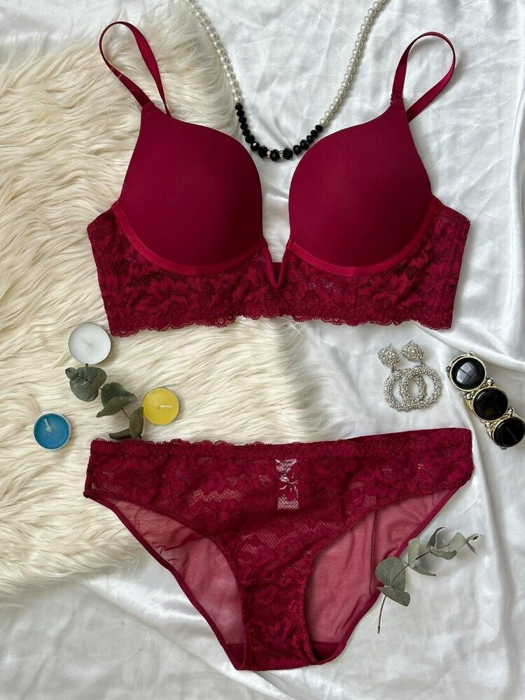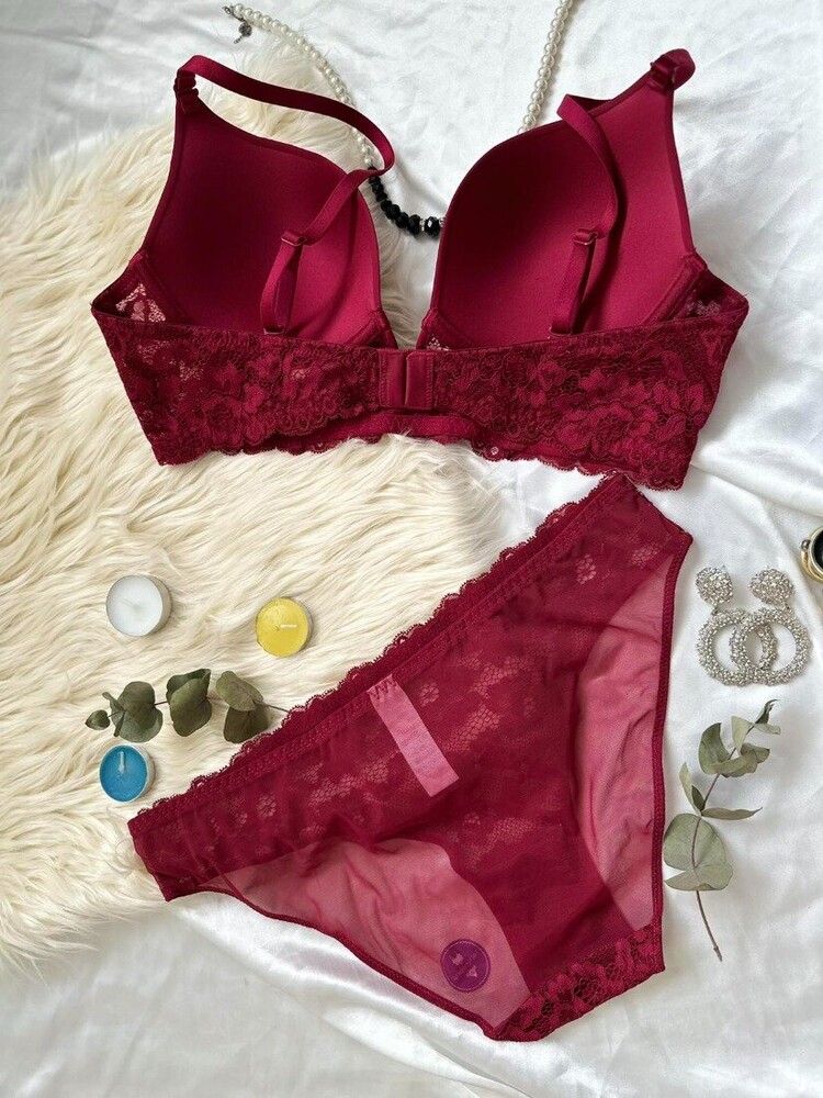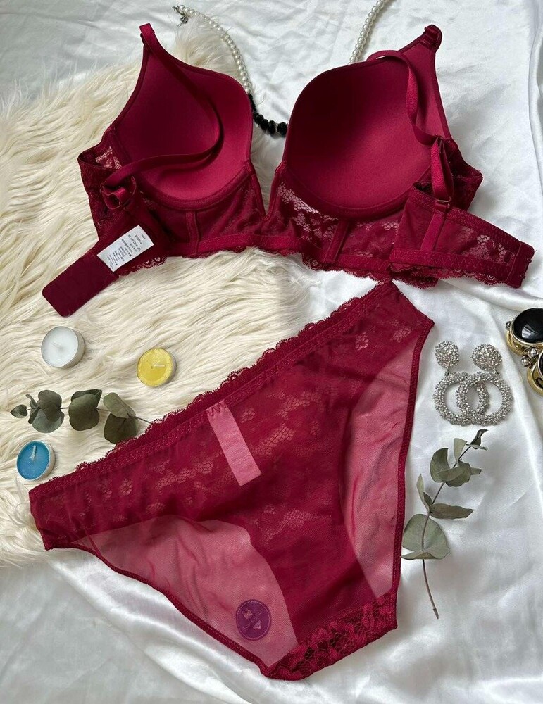 Гладкий бюстьє з мереживною вставкою на поролоні. Бретель – знімна, спина – ажурна. Застібка 2 гачки на 4 позиції. Трусики на середній посадці.
