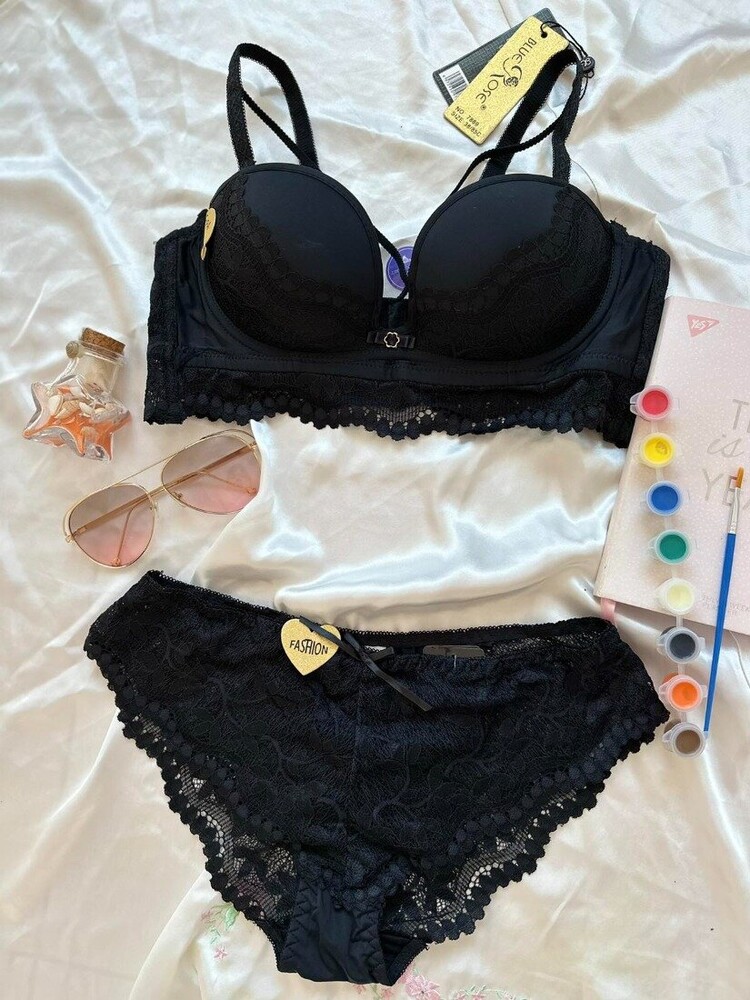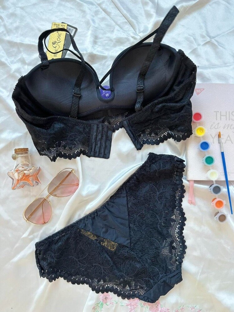Гладкий бюст з ажурними вставками на пуш-ап. Бретель – знімна, спина – ажурна. Трусики на середній посадці. Чашка С 85,95