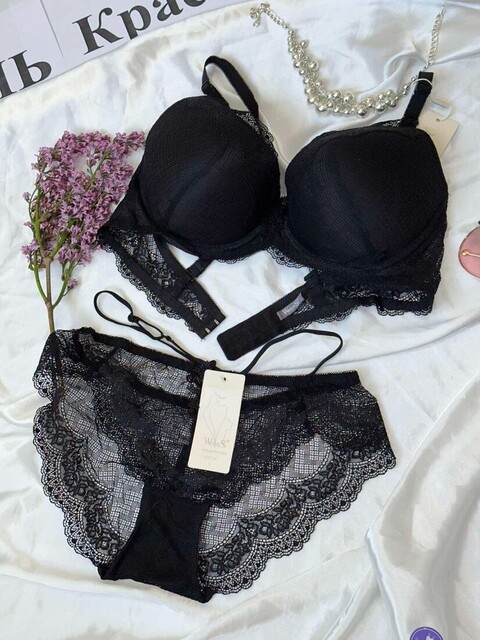 Мережевий бюстгальтер на тоненькому поролоні. Бретелі - не знімаються, спина - мереживо. Застібка 2 гачки на 4 позиції. Трусики на середній посадці Виробник Weiyesi Чашка С 80/85